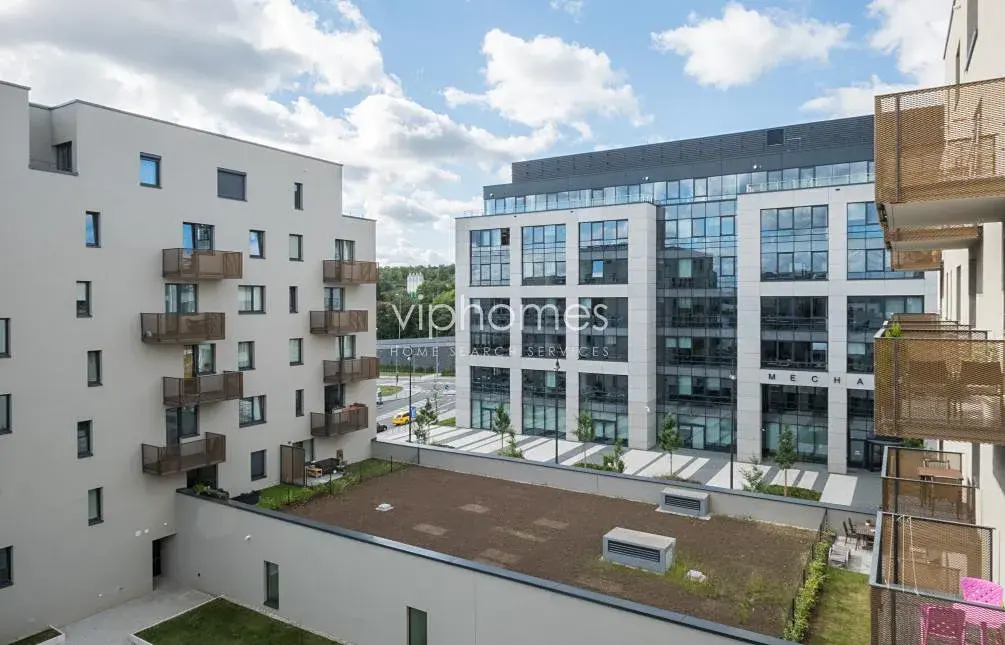Interiér bytu, dispozice 2+kk, situovaného ve 2.patře novostavby, tvoří komfortní obývací pokoj s plně vybavenou kuchyní, (mikrovlnná trouba, myčka nádobí, lednice s mrazákem), ložnice orientovaná do upraveného vnitrobloku, koupelna (vana, sprchový kout, toaleta), balkon, vstupní hala.Vestavěné skříně v chodbě a v ložnici, pračka.