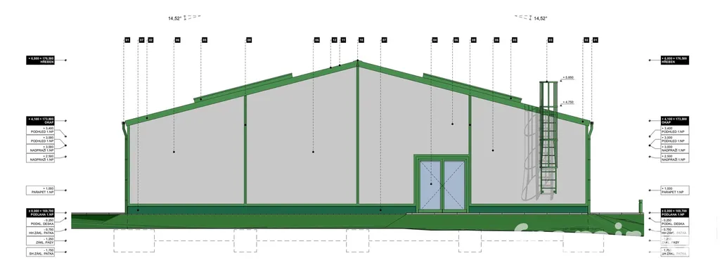 Navržená hala je jednopodlažní objekt s ocelovou nosnou konstrukcí a moderním opláštěním z PIR panelů. Dispozice zahrnuje dvě rozsáhlé skladovací plochy o výměře 595,43 m² a 360,77 m², zásobovací prostor a administrativní část o 172,83 m² určenou pro zaměstnance i zákazníky. Energetická náročnost budovy je ve třídě A díky navržené kvalitní tepelné izolaci, moderní střešní skladbě a použití tepelného čerpadla vzduch–voda jako hlavního zdroje tepla. Celková užitná plocha objektu činí 1 185,68 m².