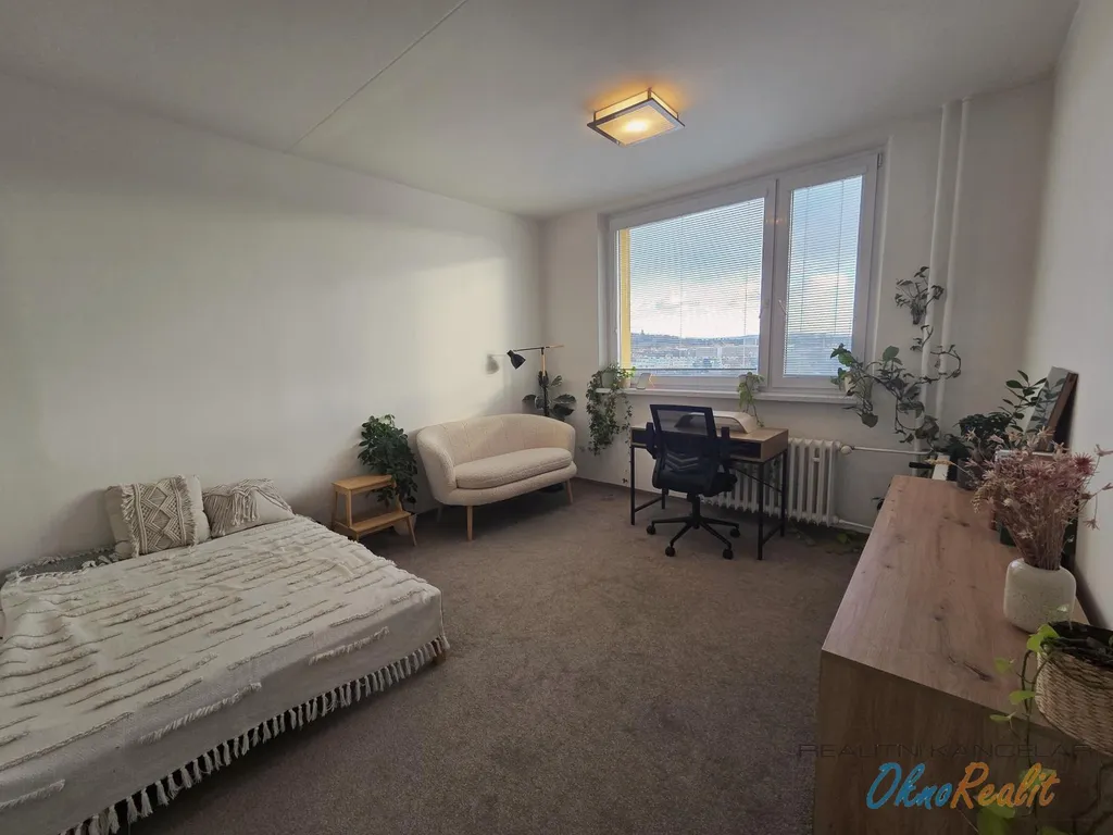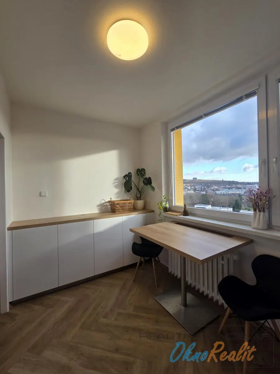 Nabízí se částečně zařízen, kuchyně je vybavena kuchyňskou linkou s vestavěnou lednicí, troubou, el. varnou deskou, myčkou, jídelním stolem, v pokoji šatní skříň, koberec. Pračka není součástí vybavení.