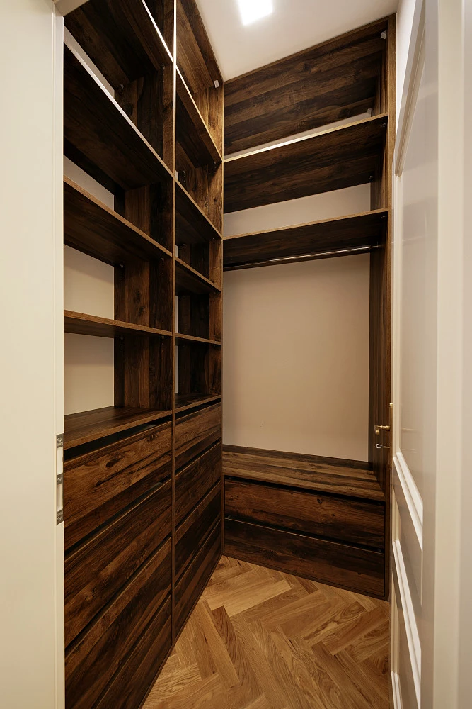 Byt disponuje velkým obývacím pokojem s kuchyňským koutem, pracovnou a ložnicí. U ložnice je připravena prostorná a kompletně vybavená šatna, koupelna s velkým sprchovým koutem (podlahové vytápění je samozřejmostí), samostatné WC s bidetem a technická místnost s místem pro prádelnu.