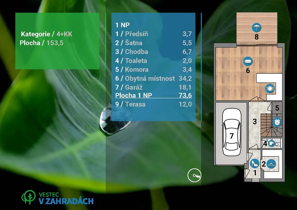 Poslední řadový rodinný dům o dispozici 4KK se zahradou je součástí nově vzniklé výstavby s názvem Vestec v zahradách.