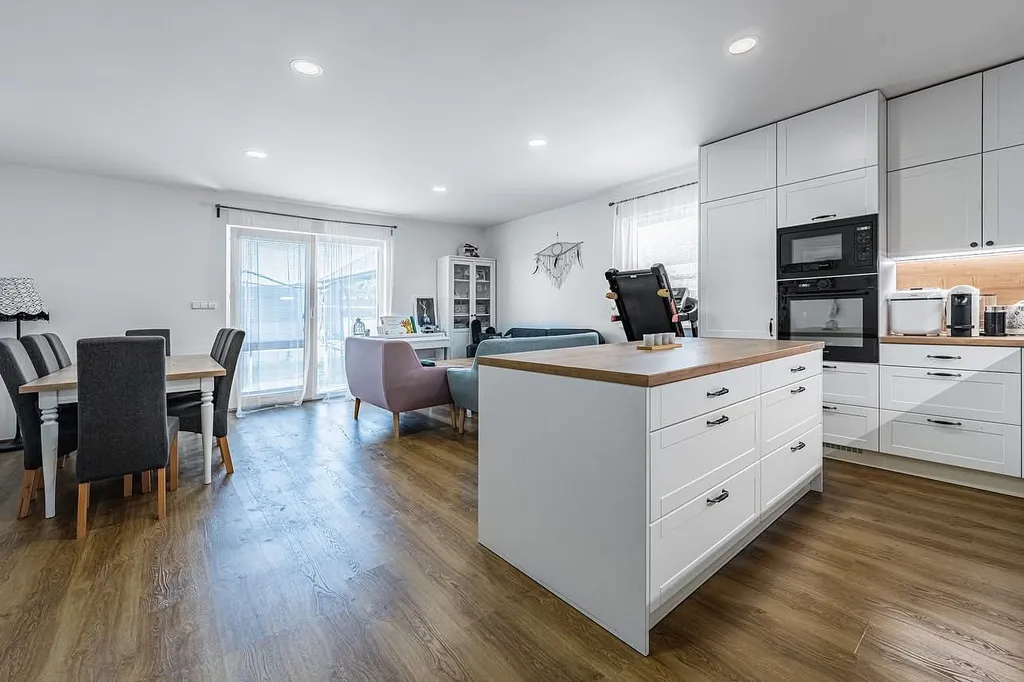 Dům je řešen jako přízemní s půdou vhodnou pro uskladnění věcí. Objekt je bez podsklepení s užitnou plochou 98,3 m² a celkovou zastavěnou plochou 119,5 m². Okolní zahrada o ploše 797 m² je dostatečně veliká pro umístění herních prvků (trampolína, hrad, skluzavka, lezecká stěna …) pro děti stejně tak jako pro vytvoření dalšího posezení s přáteli u ohniště. Stavba je realizována moderním certifikovaným systémem dřevostavby Rigips s kvalitním zateplením a sendvičovými obvodovými stěnami, které zajišťují výborné tepelně – izolační vlastnosti a nízké náklady na vytápění po celý rok. Dispozice domu odpovídá potřebám současného rodinného života – otevřený obývací prostor s plně vybavenou kuchyní a velkými prosklenými výhledy do zahrady, dále ložnice rodičů a dva samostatné dětské pokoje či pracovny. Podlahy v obytných místnostech jsou provedeny z kvalitních materiálů pro snadnou údržbu, v koupelnách a technické části je keramická dlažba. Okna a vstupní dveře jsou plastová s trojsklem a jednostranným dřevodekorem, který příjemně dotváří styl interiéru. Vytápění domu je řešeno tepelným čerpadlem vzduch – voda (cca 7 kW) s podlahovým vytápěním, což zajišťuje komfortní teplotu a velmi nízké provozní náklady. Koupelna je navíc doplněna topným tělesem. Větrání je přirozené pomocí oken. Dřevostavba je provedena z maximálně kvalitních KVH hranolů, s minerální izolací a kontaktním zateplovacím systémem – dům tak splňuje moderní standard energeticky úsporného bydlení, čemuž odpovídá zařazení objektu do klasifikační třídy C z hlediska energetické náročností budov – PENB. Valbová střecha se sklonem 25° je osazena krytinou Betonpres v břidlicově černém odstínu, přispívající k elegantnímu vzhledu domu. Fasáda je navržena ve světle béžovém tónu s tmavším soklem – kombinace působí moderně a nadčasově. Stavba stojí na rovinatém pozemku v klidné části obce, s výborným příjezdem po veřejné komunikaci ve vzdálenosti 291 metrů (6 minut chůze) od zastávky MHD. Místo je ideální pro rodiny s dětmi – v blízkosti je příroda, cyklostezky a ve Strakonicích kompletní občanská vybavenost (školy, školy, obchody, lékaři, služby).