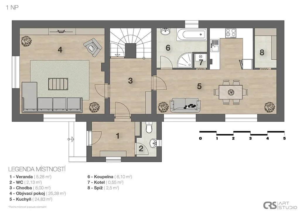 Hlavní stavba rodinného domu o zastavěné ploše103 m2 je v základu původní venkovský dům, který léty prošel procesem dostaveb a přestaveb. V aktuální podobě, v jaké dům sloužil jako trvalé obydlí mladé rodiny, poskytuje ve dvou podlažích 147 m2 obytné plochy v dispozici 4+1 (viz plánky podlaží ve fotogalerii). Rodinný dům je ve stavu, kdy může být prakticky okamžitě obýván. Pouze je nutná náhrada za vysloužilý stávající plynový kotel. V obci aktuálně probíhá výstavba splaškové kanalizace a je uzavřena smluvní dokumentace vlastníkem nemovitosti k napojení. Stávající stav je odvod domovních splaškových vod do žumpy. Dům je napojený na obecní vodovod a na plynovou přípojku. Obvodové zdivo v 1 NP je 45 cm, v 2 NP jsou štítové zdi 45 cm, zbytek 30 cm. Zdivo není opatřené tepelnou izolací. Izolace stropu a šikmin 2 NP je 10 cm Orsil. Výška stropu 1 NP 270 cm, 2 NP 235 cm. Krytina střechy je plechová (alukryt šablony). Původní kamenný sklípek pod domem o výměře 7,5 m2.