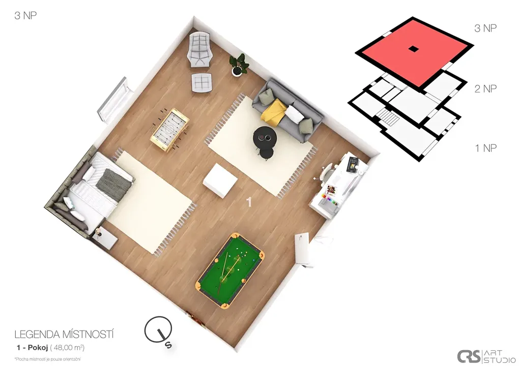 - pozor, v 3D návrhu není zohledněn skos stěn/střechy, bude opraveno. Rozložení nábytku tedy nemusí odpovídat reálným možnostem. Informace doplníme.