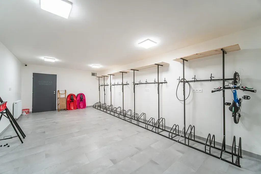 Společná kolárna, úložný Ski box, prádelna s pračkou/sušičkou a společenská místnost.