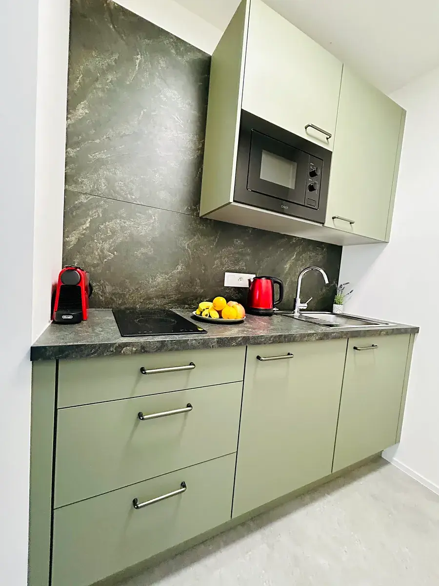 Na obývací pokoj navazuje nová moderní kuchyňská linka XXXLutz vybavena značkovými spotřebiči Candy: lednice, indukční deska, horkovzdušná trouba/mikrovlnka Candy. Prostor je řešen prakticky a vkusně, aby poskytoval maximální komfort při vaření i stolování.