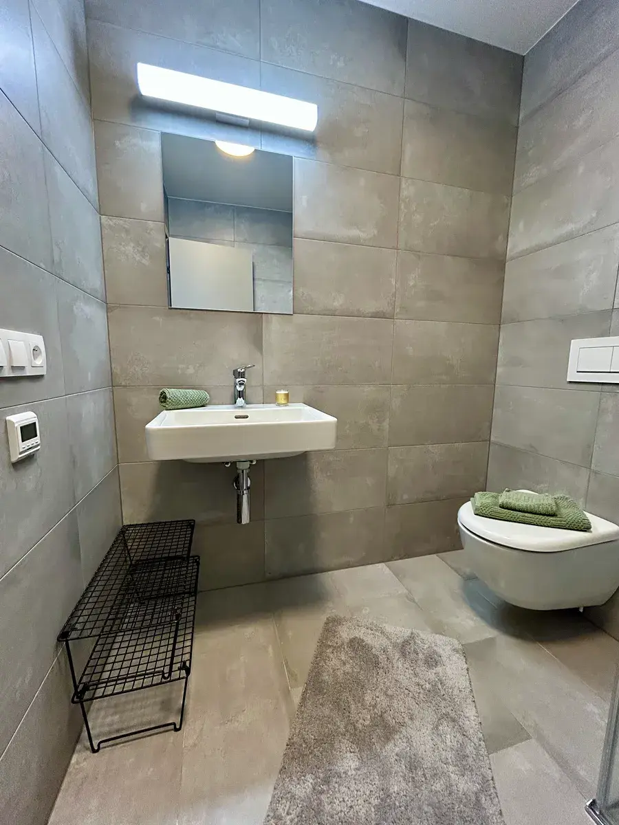 Po vstupu do útulné předsíně (1,80 m2) vejdeme do moderní koupelny se sprchovým koutem a toaletou (3,50 m2). V koupelně podlahové vytápění, design otopný žebřík, sanita Laufen a baterie Hansgrohe.