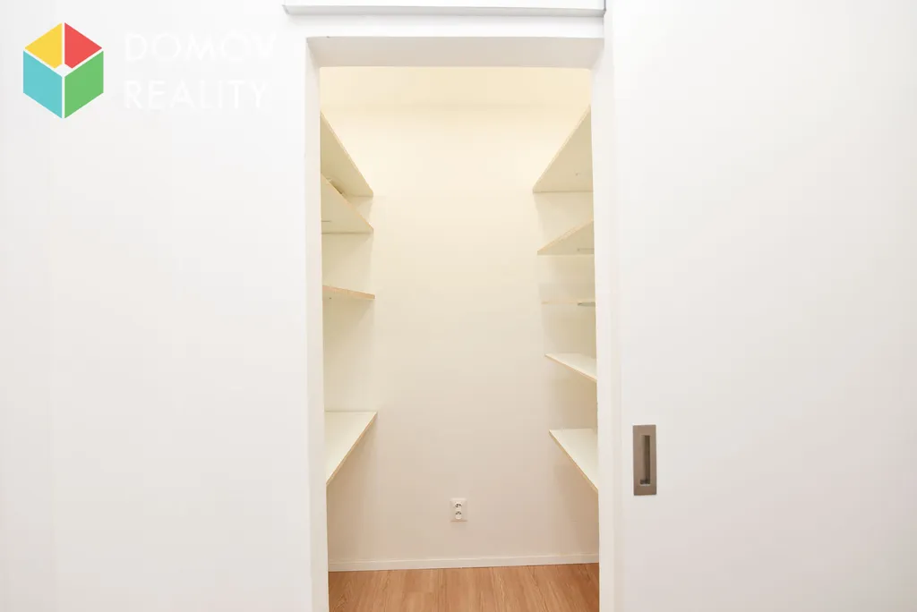 Dále byt nabízí ložnici s vestavěnými skříněmi a televizí, elegantní koupelnu se sprchovým koutem, pračkou se sušičkou, samostatné WC a praktickou komoru ve vstupní chodbě vybavenou regály.