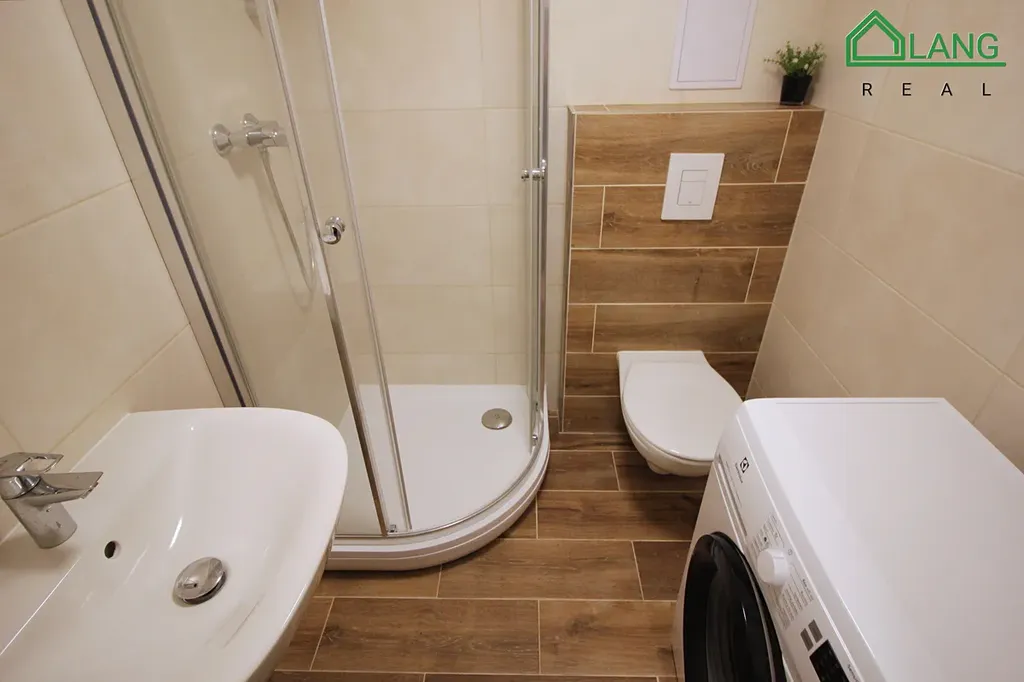 V koupelně najdete sprchový kout, umyvadlo, pračku a WC.