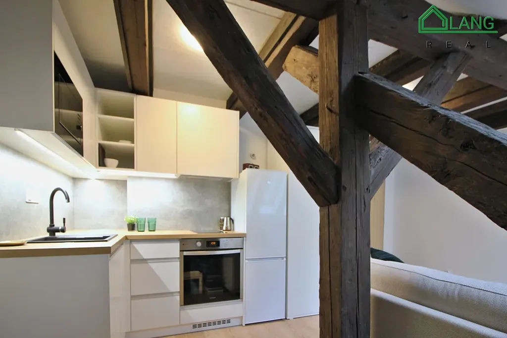 Byt je díky velkým střešním oknům velmi světlý a vzdušný, prošel kompletní renovací a je plně zařízený na klíč – stačí přijet s kufrem a hned bydlet.