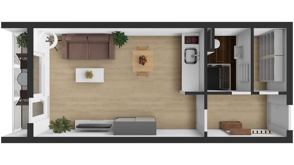 Byt je vybaven kuchyňskou linkou, která zahrnuje dvouplotýnkový vařič, malou lednici s mrazákem a pračku. Vytápění a ohřev vody jsou zajištěny dálkově. Samostatné měření vody, elektřiny a tepla vám umožní mít kontrolu nad spotřebou.