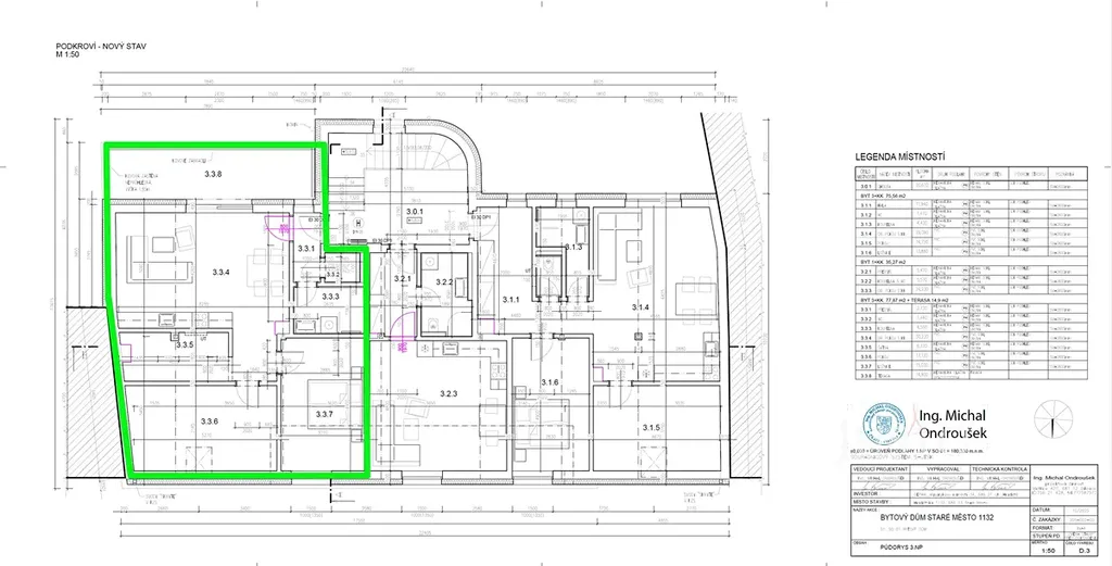Byt se nachází ve 3. nadzemním podlaží třípodlažního cihlového domu a je navržen jako jednopodlažní.