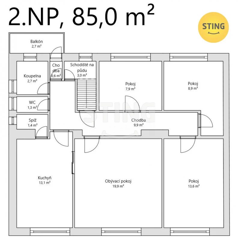 Druhé patro nabízí obdobnou dispozici, rovněž se vstupem na balkon a také přístup na velkou pochůzí půdu.