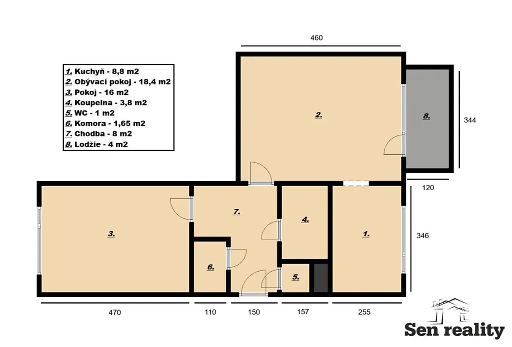 Dispozici bytu tvoří prostorný obývací pokoj se vstupem na lodžii, neprůchozí ložnice, kuchyň, koupelna s prostorným sprchovým koutem, samostatné WC, vstupní chodba, komora. Součástí bytu je sklepní kóje v suterénu domu o výměře 2 m2.