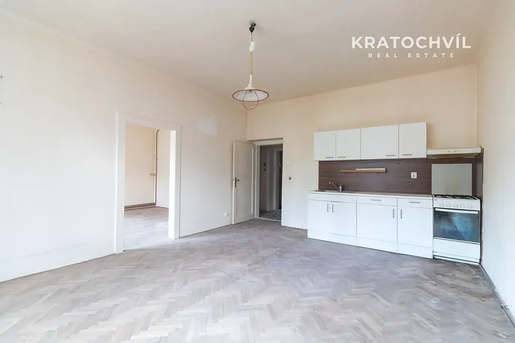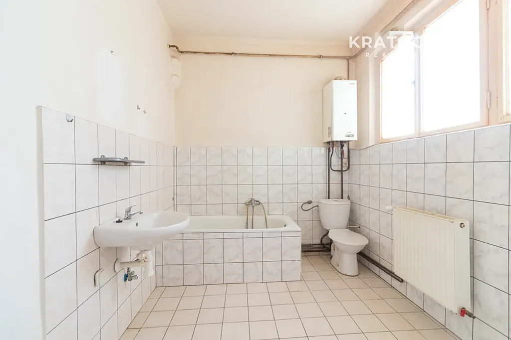 V prostorné koupelně je vana s umyvadlem a toaletou. Byt je nazařízený, pouze je k dispozici kuchyňská linka s plynovým sporákem.