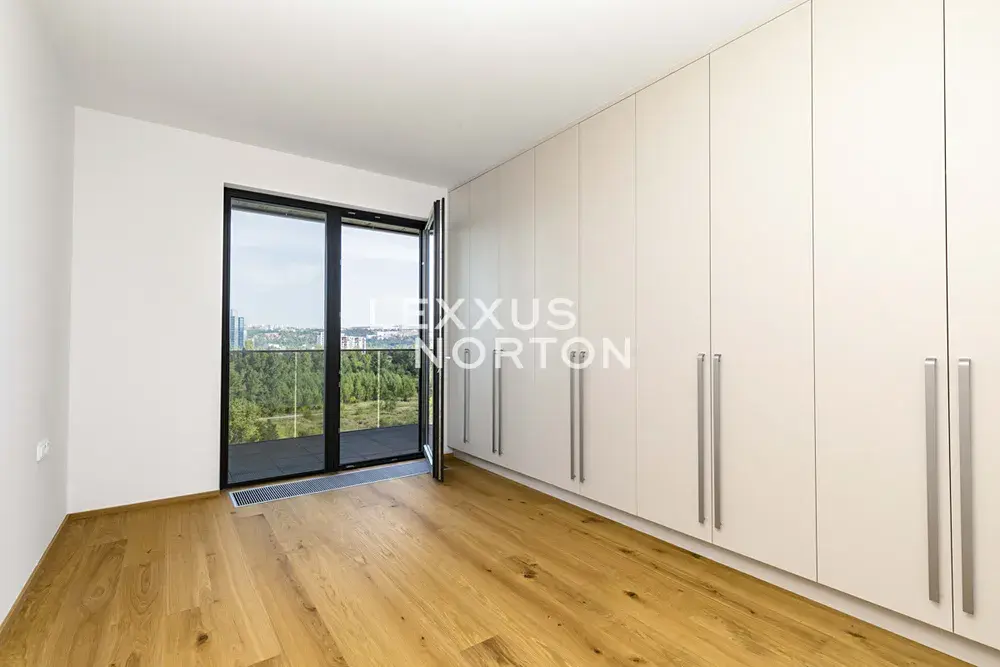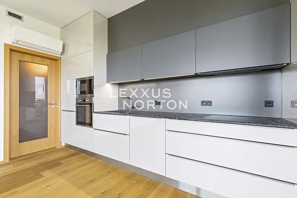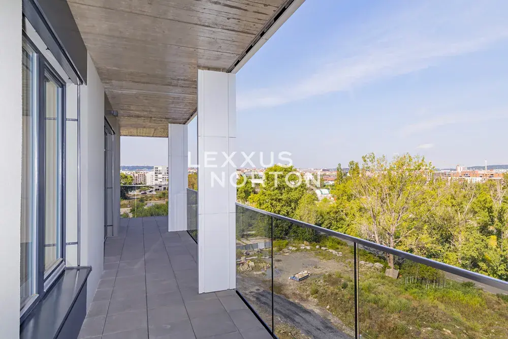 Byt se nabízí nezařízený a k součástí vybavení patří kuchyňské spotřebiče, klimatizace, předokenní žaluzie, rekuperace, podlahové topení, videotelefon, pračka, sušička, vestavěné skříně a dřevěné podlahy.