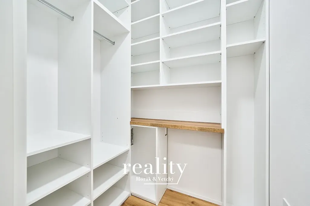 Součástí bytu je také prostorná sklepní kóje. Je možné si pronajmout i garážové stání v podzemní garáži rezidence (+ 1500 Kč/měsíc).