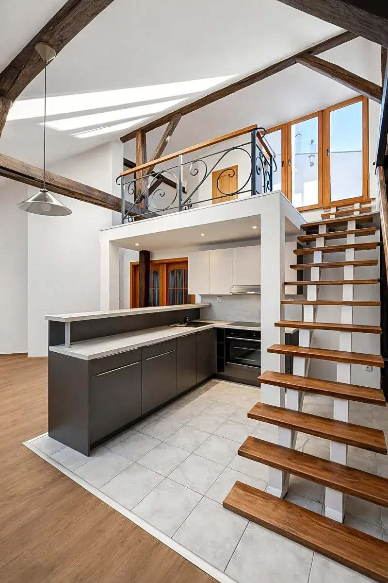 V dolním patře je velký obývací pokoj s kuchyňským koutem (vysoký strop), 3 neprůchozí ložnice, koupelna s vanou a bidetem, samostatná toaleta, komora, předsíň. V horním patře je otevřená galerie (pracovna/ spaní pro hosty), koupelna s toaletou, klidná terasa do vnitrobloku.