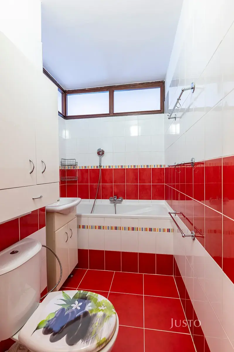 Koupelna disponuje vanou a je laděna do moderních barev.