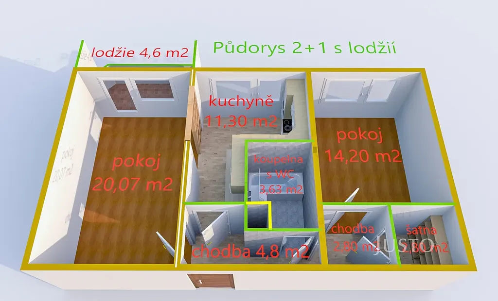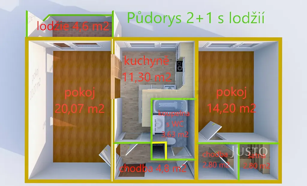 Byt má lodžii o velikosti 4,6 m², která nabízí příjemný výhled do okolní zeleně, a sklep o rozloze 2 m² pro uskladnění sezónních věcí, obojí se nezapočítává do výměry bytu.