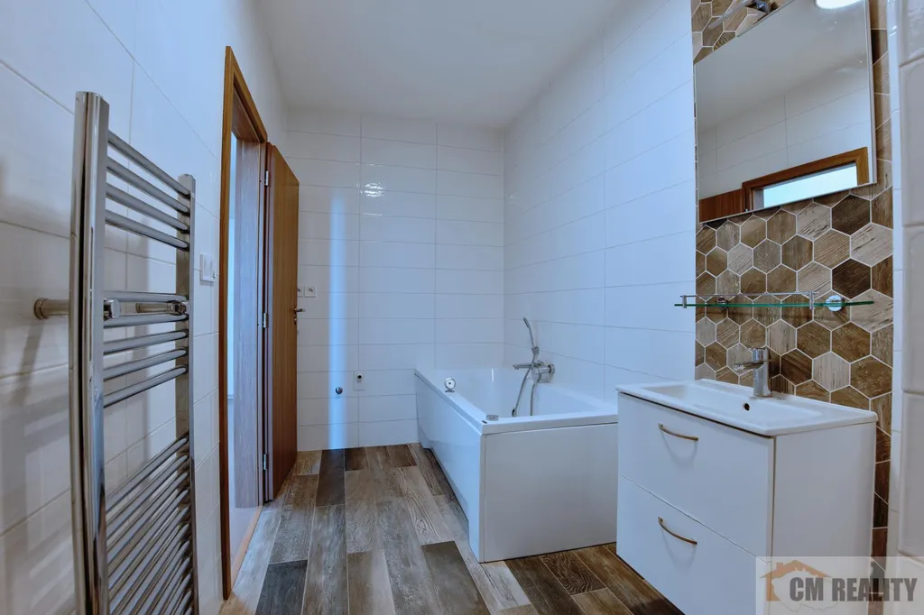 V koupelně je masážní vana a závěsné WC. Interiér doplňují plovoucí podlahy a designová svítidla. Dům má plastová okna a centrální vytápění včetně ohřevu vody.