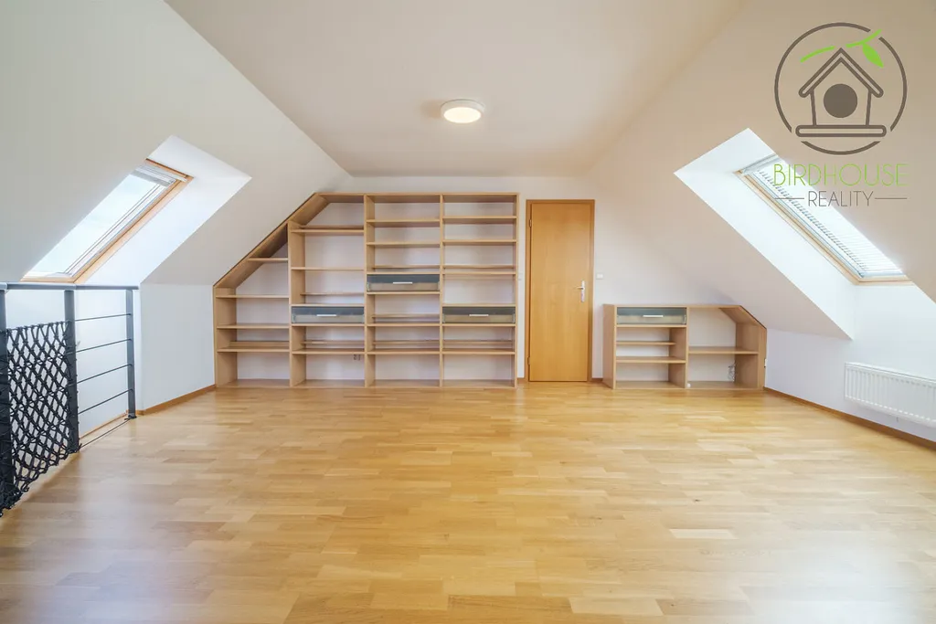 Z obývacího pokoje vede schodiště do horního podlaží, kde se nachází otevřená galerie využívaná jako ložnice s prostornou šatnou (25,78 m²) a druhá komfortní koupelna s vanou i sprchou (5,98 m²).