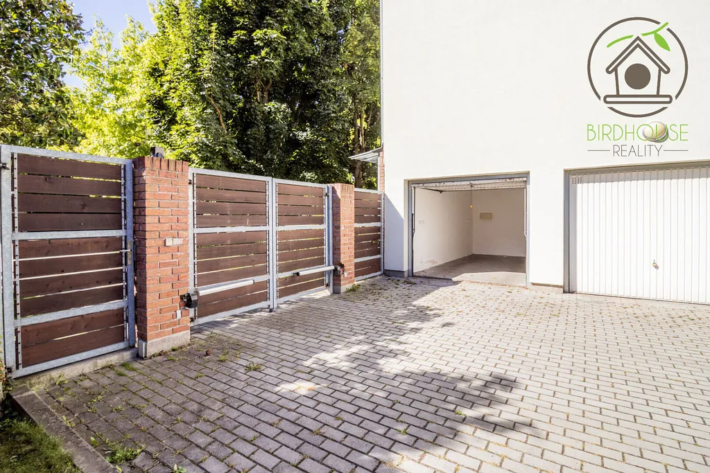 K bytu náleží vlastní garáž o velikosti 14,17 m² (výška 2,73 m; výška vjezdu 2,07 m; šířka 2,69 m; délka 5,27 m) s elektřinou a úložným prostorem, sklep 2,56 m², a také podíl na pozemku umožňující parkování. V domě je k dispozici společná kočárkárna a udržovaný vnitroblok s dětským hřištěm a zahradou, která je ideálním místem pro relax.