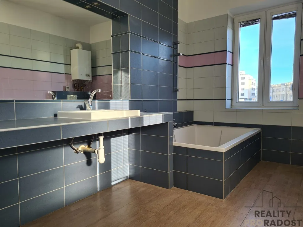 - koupelna s velkou vanou, která slouží i jako sprchový kout, dále zázemím pro pračku a sušičku