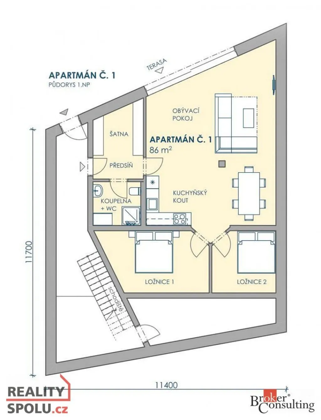 Apartmán I (přízemí): Přímý vstup na terasu s venkovním posezením. K dispozici jsou 2 ložnice (dvoulůžka) a rozkládací gauč (plnohodnotné dvoulůžko) v obývacím pokoji – celkem 6 lůžek. Koupelna se sprchovým koutem a toaletou, kuchyňský kout s jídelnou a obývací pokoj.