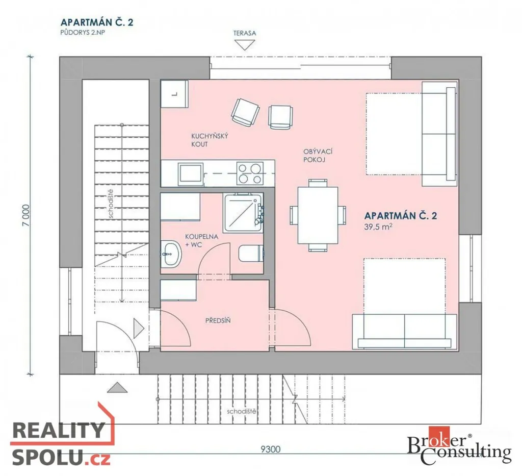 Apartmán II: Přímý výstup na velkou terasu. Obývací pokoj se dvěma rozkládacími gauči (plnohodnotná dvoulůžka) – celkem 4 lůžka. Koupelna se sprchovým koutem a toaletou, kuchyňský kout a jídelna.