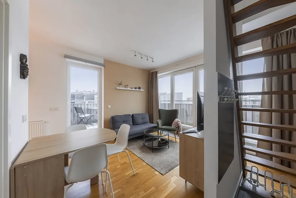 Tento elegantní mezonet o dispozici 2+kk s výměrou 40 m² je situován ve 3. a 4. nadzemním podlaží a je ideální jak pro osobní užívání, tak jako investiční příležitost.
