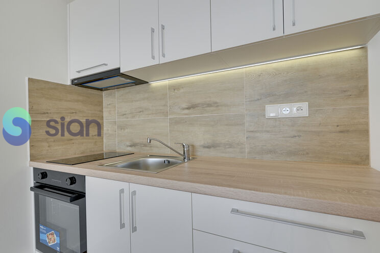 Kuchyňská linka je dělaná na míru a je opatřena vestavěnými spotřebiči (sklo keramická deska a trouba), digestoř.