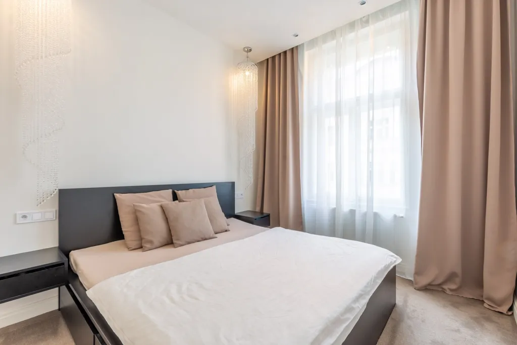Byt se nabízí nadstandardně vybavený. Kuchyňská linka disponuje novými spotřebiči - lednicí, myčkou, vestavěnou elektrickou troubou, mikrovlnnou troubou, sklokeramickou deskou a digestoří. Obývací část je zařízení jídelním stolem s židlemi, prostornou sedací soupravou, křeslem, konferečním stolkem a praktickou knihovnou. V prosvětlené ložnici najdeme postel. V moderní koupelně se nachází vana, umyvadlo se zrcadlem, toaleta a bidet. Předsíň je vybavená vestavěnou šatní skříní.