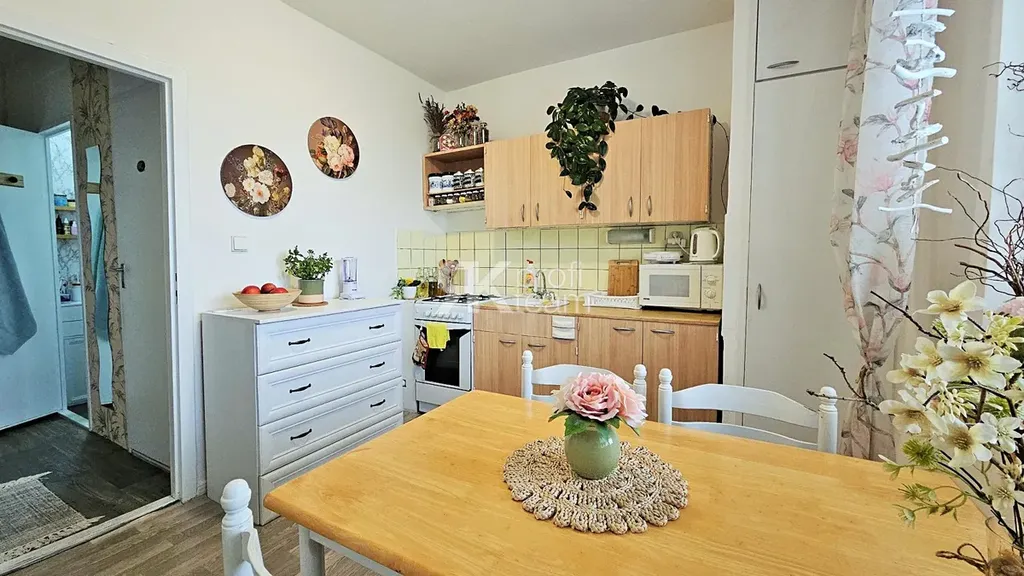 Byt je v původním, ale velmi udržovaném stavu. Nabízí velkou čtvercovou kuchyni, kam se vejde jídelní stůl se židlemi, prostorný pokoj se vstupem na lodžii. Koupelna a WC jsou zvlášť.