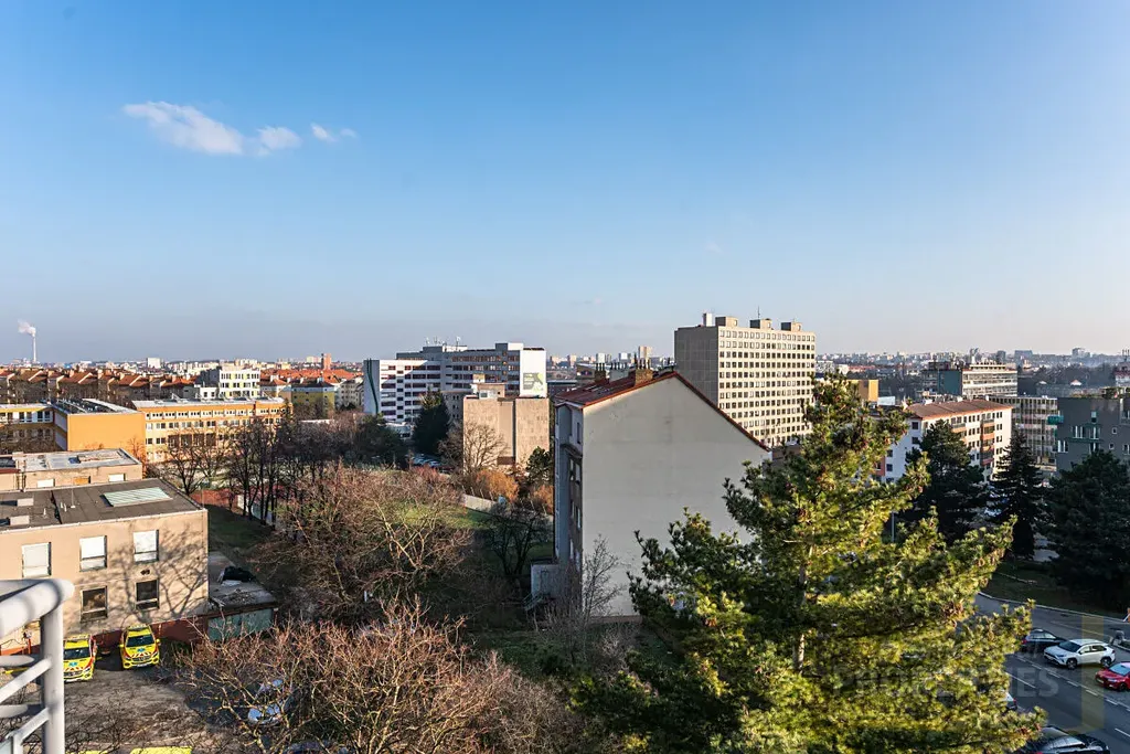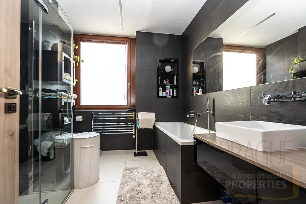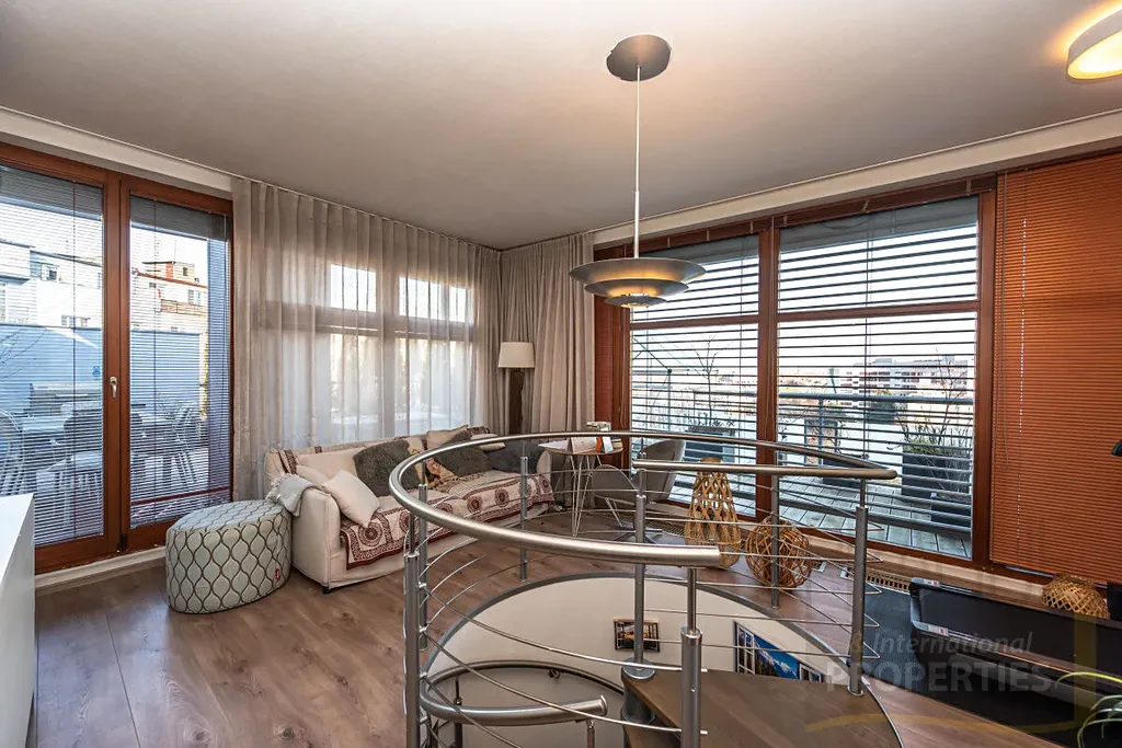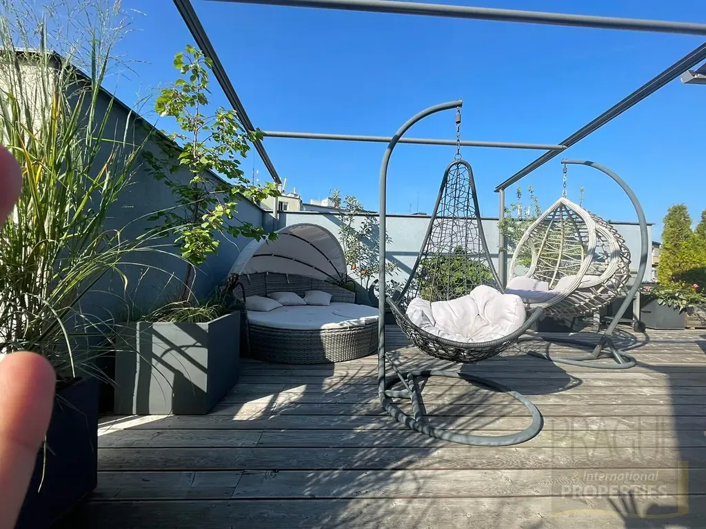 Byt má jednu terasu v hlavní ložnici a další velkou terasu cca 75m2 ve druhém patře bytu s panoramatickými výhledy na Prahu.