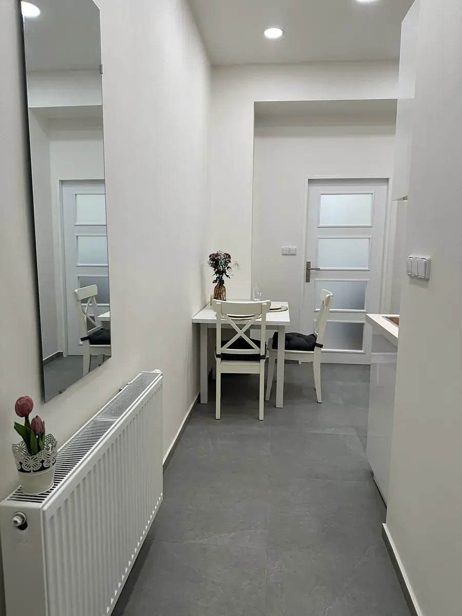 Interiér prošel kompletní rekonstrukcí, při které byly použity kvalitní materiály. Koupelna je vybavena pračkou. V kuchyni najdete novou linku se všemi vestavěnými spotřebiči: lednicí s mrazákem, myčkou, mikrovlnnou troubou, klasickou troubou, digestoří a indukční varnou deskou. Součástí vybavení je také malý jídelní stůl se židlemi a pohovka v obývací části. Spací zóna s manželskou postelí je oddělena příčkou, což zajišťuje více soukromí. Byt je připraven k okamžitému nastěhování.