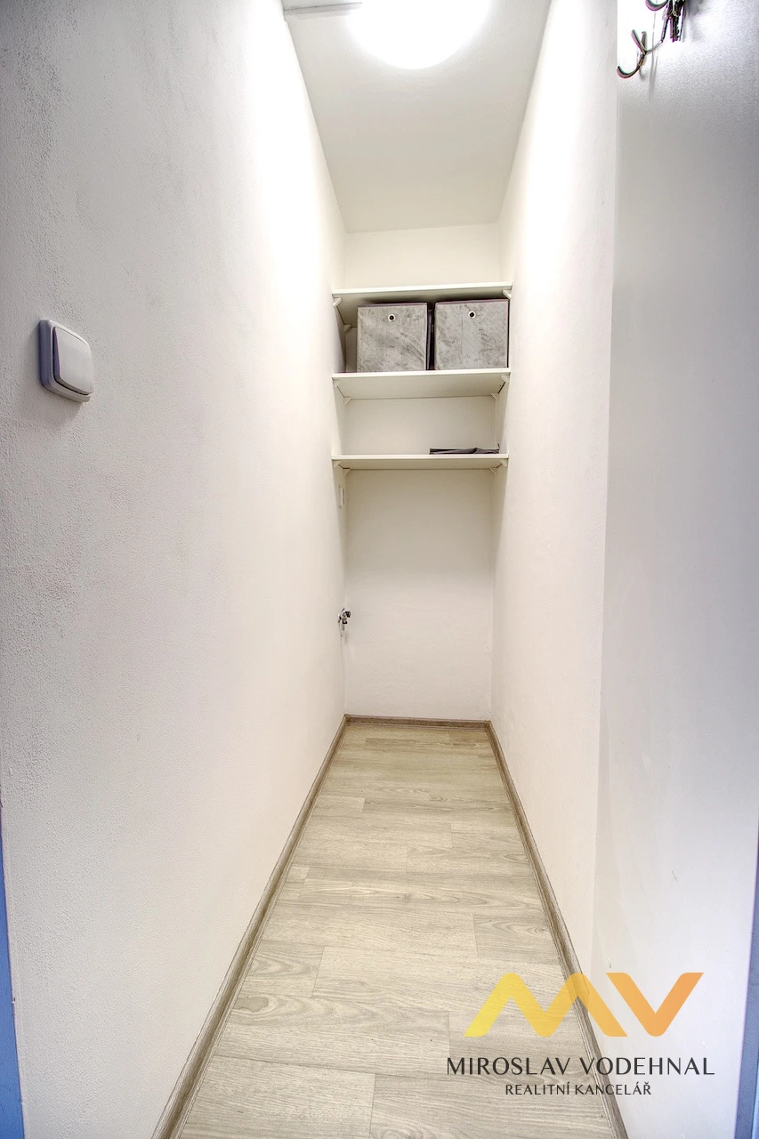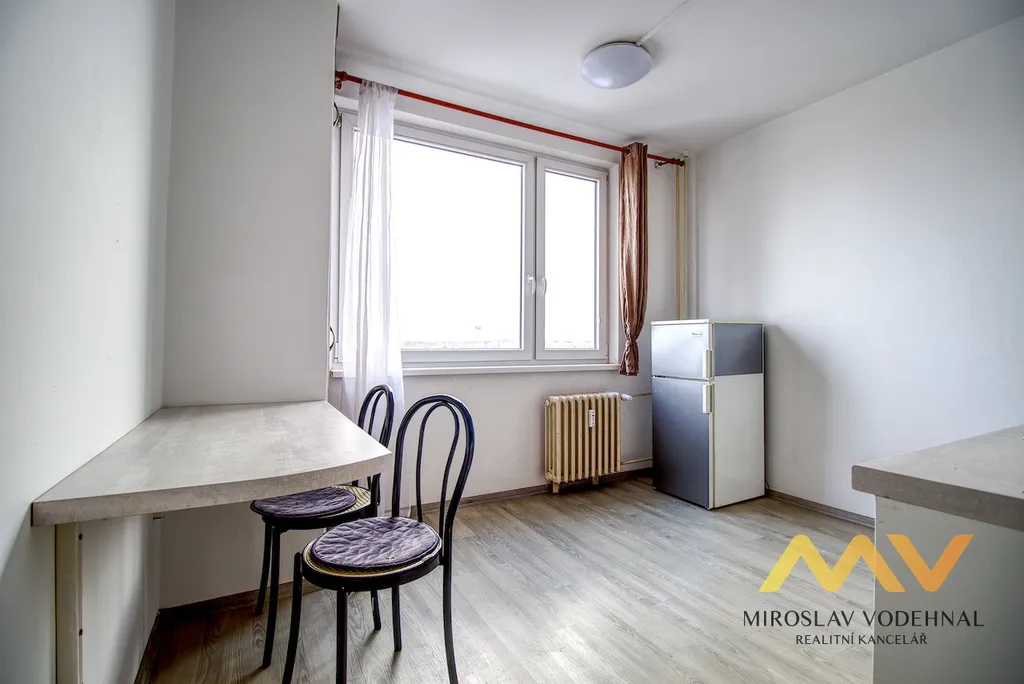 Jedná se o částečně zařízený, rekonstruovaný byt s pěkným výhledem do zeleně. Prostorná obyvatelná kuchyň nabízí kuchyňskou linku se spotřebiči (sklokeramická varná deska, el. trouba, odsavač par) a lednici s mrazákem. Pokoj je vybaven pohovkou, obývacím nábytkem a psacím pracovním stolem. Byt má zděné bytové jádro, koupelna je se sprchovým koutem a toaletou. V komoře, umístěné hned za vchodovými dveřmi, je velký úložný prostor a přípojka na pračku. K bytu náleží sklepní kóje.
