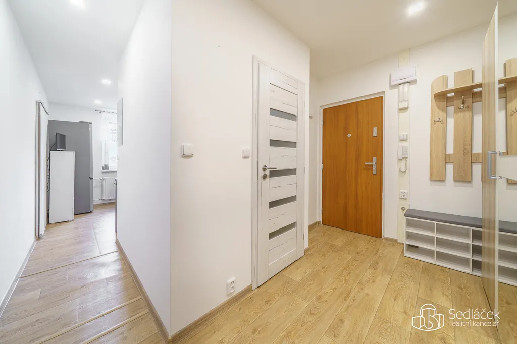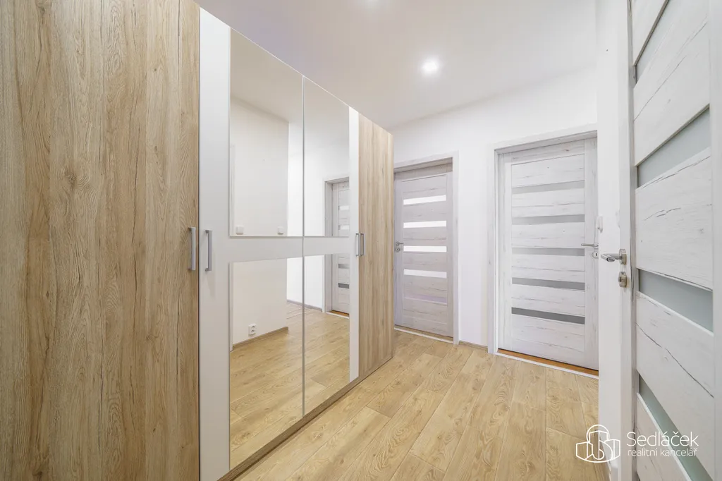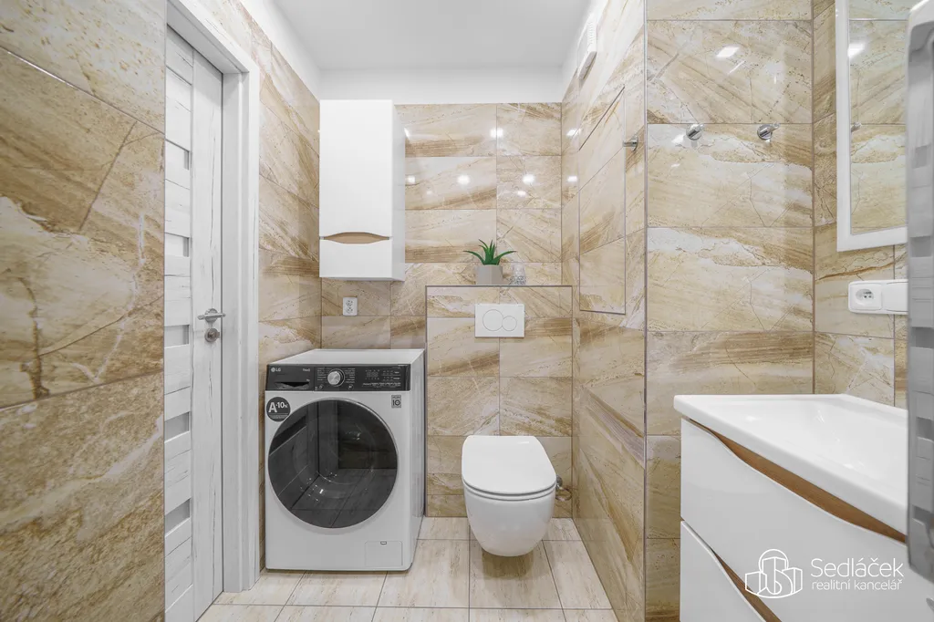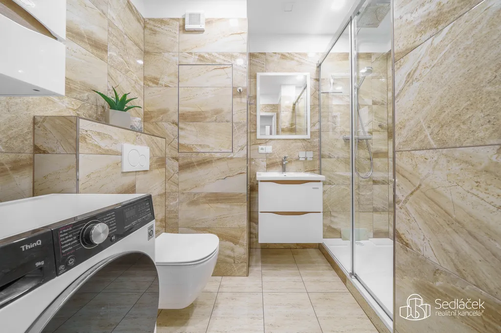 V koupelně najdete moderně řešené nové jádro se závěsným WC, které dodává prostoru čistý a současný vzhled. Předsíň je upravená, světlá a nabízí možnosti pro praktické úložné řešení.