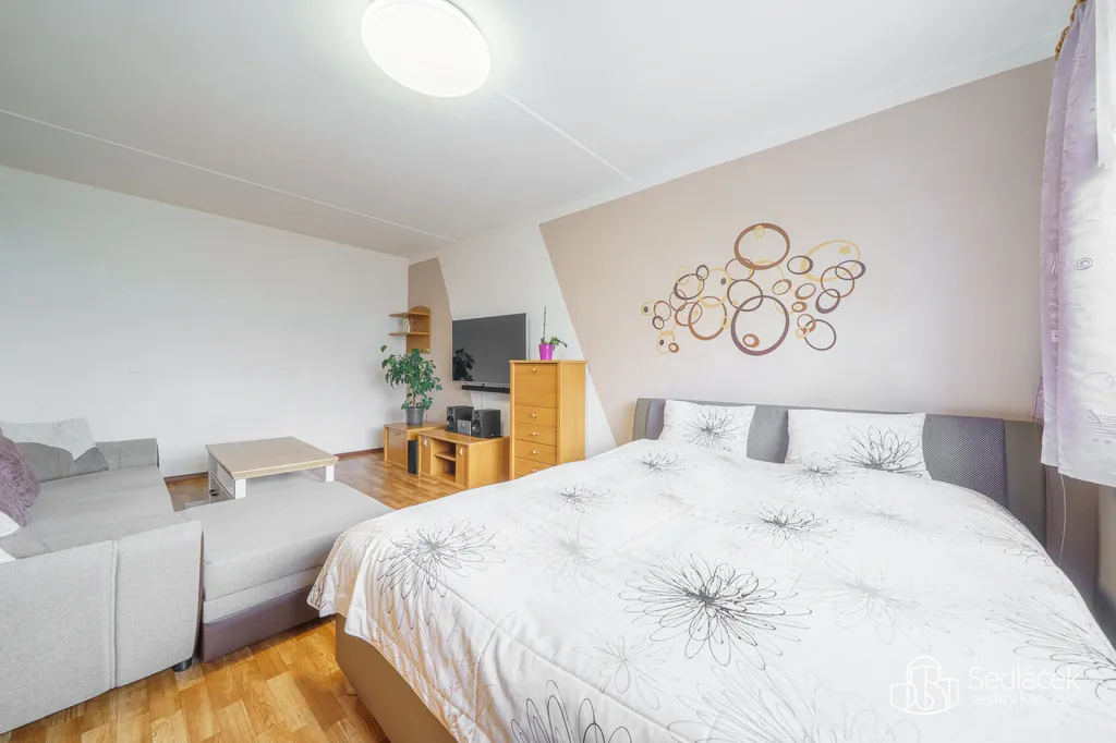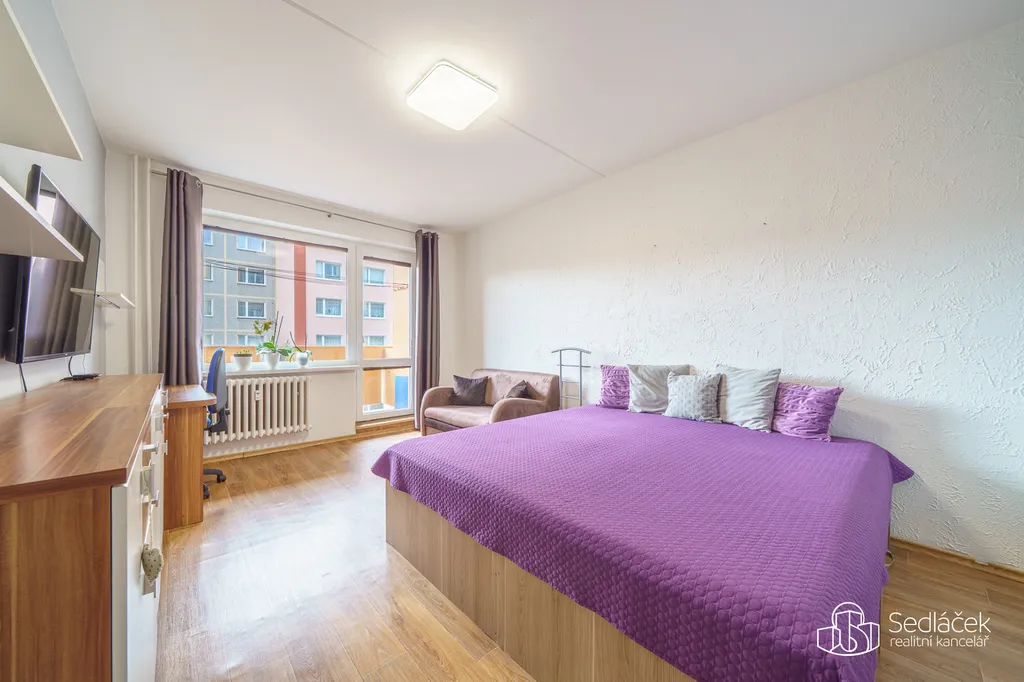 Velkou výhodou bytu je prostorná zasklená lodžie, která nabízí místo k posezení i mimo letní sezónu.