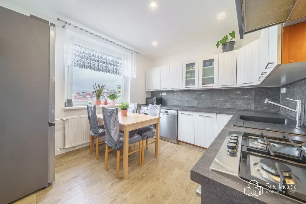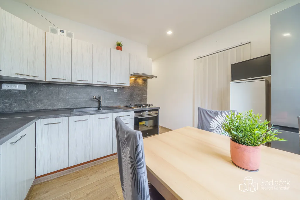 Kuchyňská linka je velmi pěkná a prakticky řešená, s prostorem pro spotřebiče jako myčka nebo sušička. Pračka je umístěna v koupelně. Spotřebiče nejsou součástí prodeje, což umožňuje novému majiteli vybrat si vlastní bez omezení. Vaření je aktuálně na plyn, ale jističe jsou dimenzované i pro indukční varnou desku.