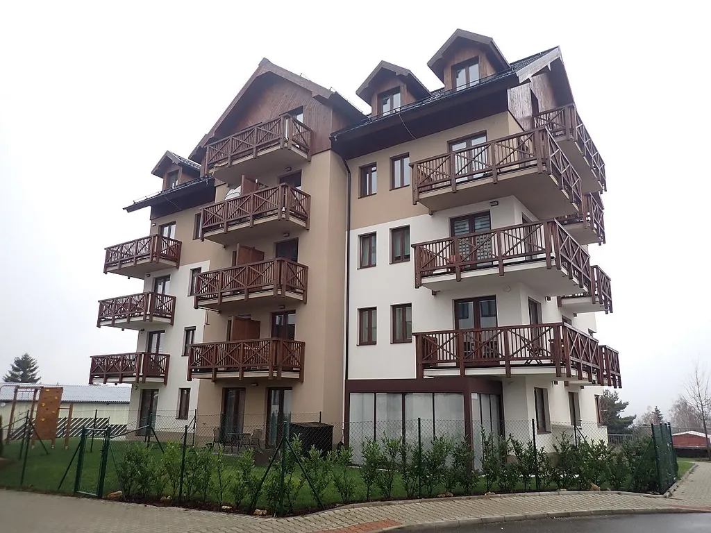 Bytový dům je horského typu, který vkusně zapadá do této lokality. Působí moderně, čistě a klidně. Vytápění objektu zajištuje vlastní plynová kotelna, druh svislé nosné konstrukce tvoří cihly a tvárnice. Objekt je napojený na vodovod a kanalizaci. Výhodou je pouze 18 bytových jednotek v 6-ti podlažích. PENB skupina B.