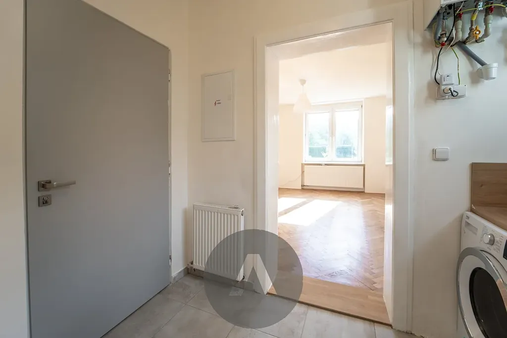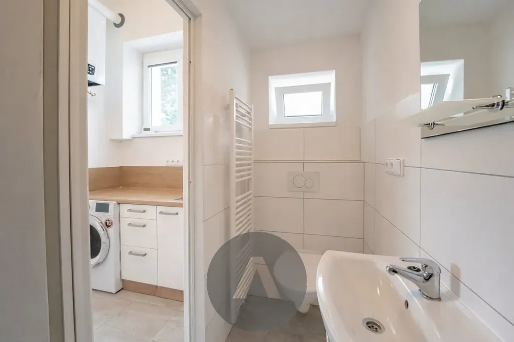 Druhá garsonka se nachází v suterénu domu a nabízí větší podlahovou plochu 35 m². Oproti přízemní jednotce působí prostorově velkoryseji a disponuje plnohodnotnějším kuchyňským i koupelnovým zázemím. Bytová jednotka je bez nábytku, připravena k zařízení dle vlastních potřeb. K dispozici je koupelna se sprchovým koutem, pračka, lednice a vaření je řešeno vařičem.