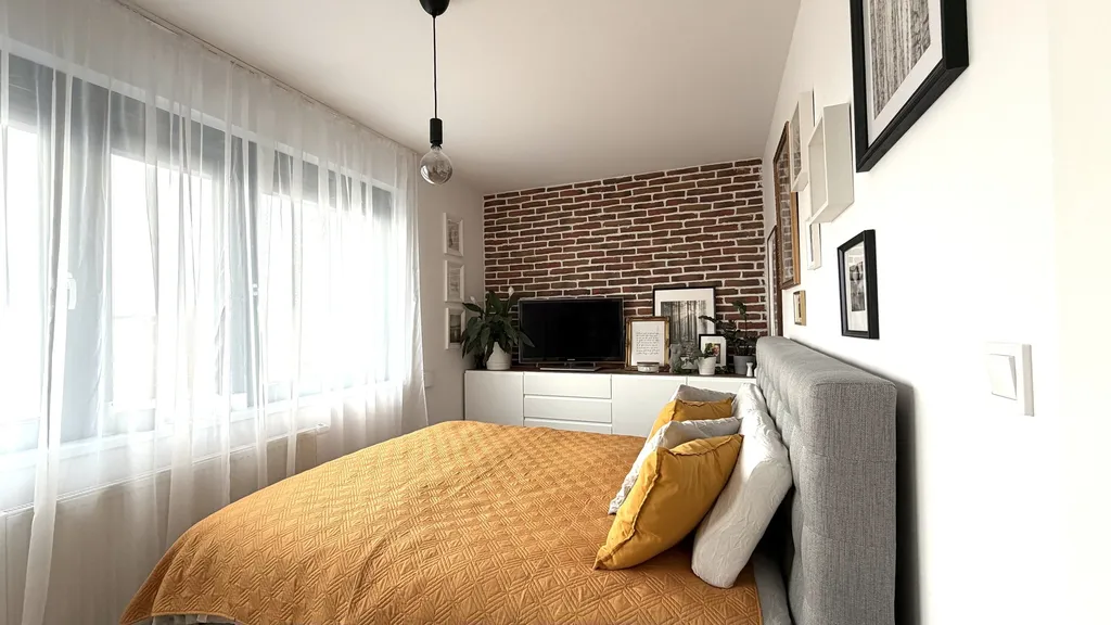 Dispozičně je byt řešen velmi prakticky. Vstupní hala slouží zároveň jako chodba propojující všechny místnosti v bytě a díky šatně s dostatkem úložných prostor s nábytkem na míru, umožňuje minimalistický a čistý design. Obývací pokoj s kuchyňským koutem je propojen s balkonem. Kuchyňská linka vyrobena na míru od truhláře je vybavena moderními spotřebiči a poskytuje dostatek pracovního i odkládacího prostoru. Ložnice s velkou vestavnou šatní skříní a komodou působí velmi útulně a vzdušně. Koupelna je vybavena kvalitními prvky jako je sprchový kout, závěsné WC a vestavné umyvadlo se skříňkou a nechybí ani přípojka na pračku a sušičku.