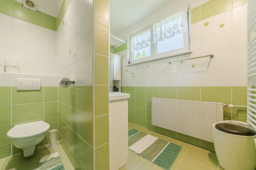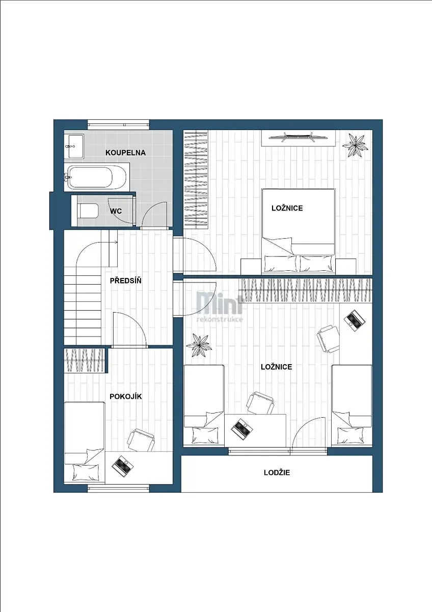 V prvním patře se nachází chodba a tři samostatné ložnice se skříněmi, lodžie, koupelna se sprchovým koutem a toaleta.