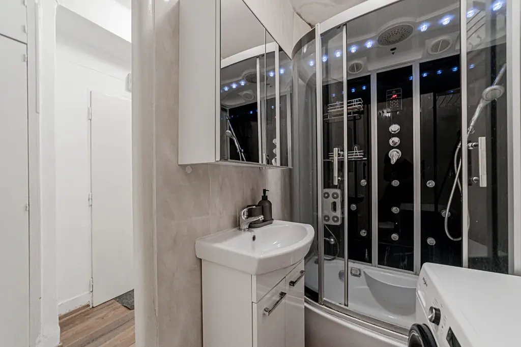 Koupelna je vybavena původním umakartovým jádrem a sprchovým koutem, který umožňuje základní komfortní využití. Na podlahách jsou plovoucí podlahy.