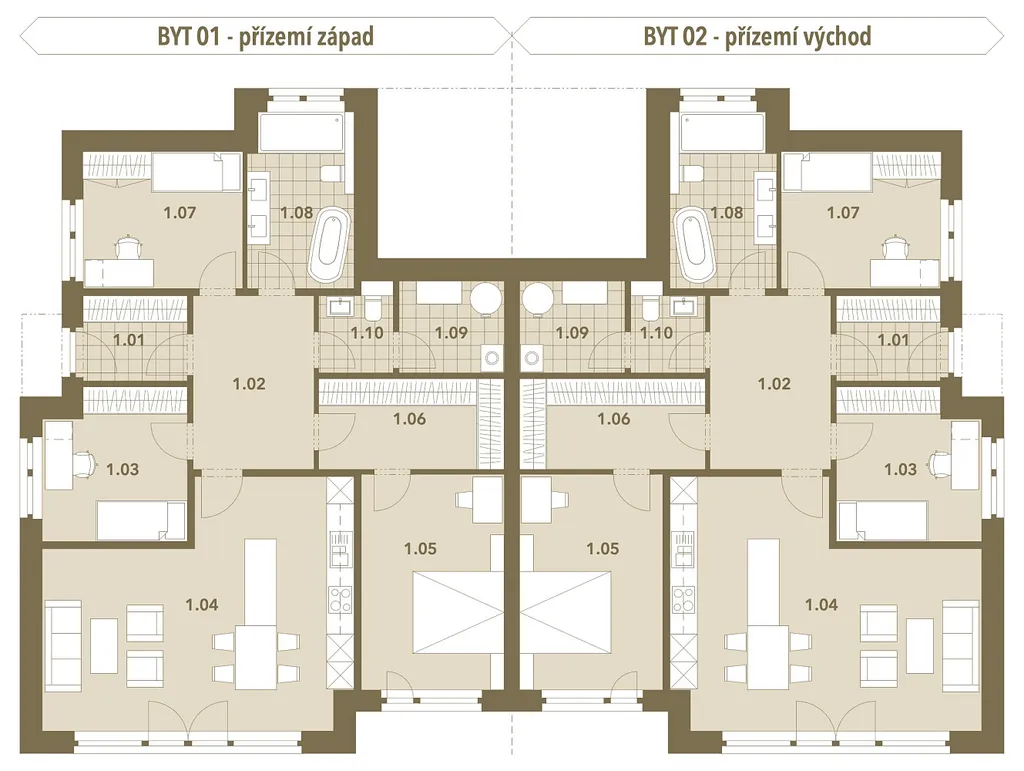 Nabízíme přízemní bydlení 4+kk o ploše 109 m² se soukromou zahradou cca 400 m², terasou a vlastním parkováním pro dvě auta. Dispozicí, soukromím i venkovním prostorem odpovídá rodinnému domu, ale v režimu bytu – bez starostí, bez kompromisů.