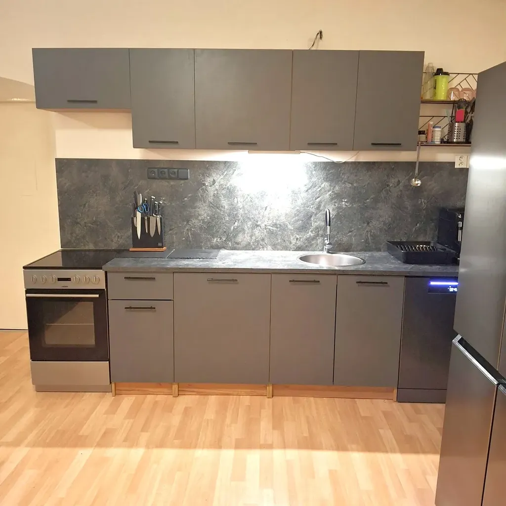 Byt je po rekonstrukci, ve velmi dobrém technickém stavu a částečně zařízen. K dispozici je kuchyňská linka se spotřebiči, dále vestavěné šatní skříně poskytující dostatek úložných prostor. Koupelna je vybavena vanou a WC, s připraveným místem pro pračku. Podlahy jsou řešeny kombinací plovoucích podlah, koberců a dlažby, což podtrhuje praktický a zároveň komfortní charakter bytu.