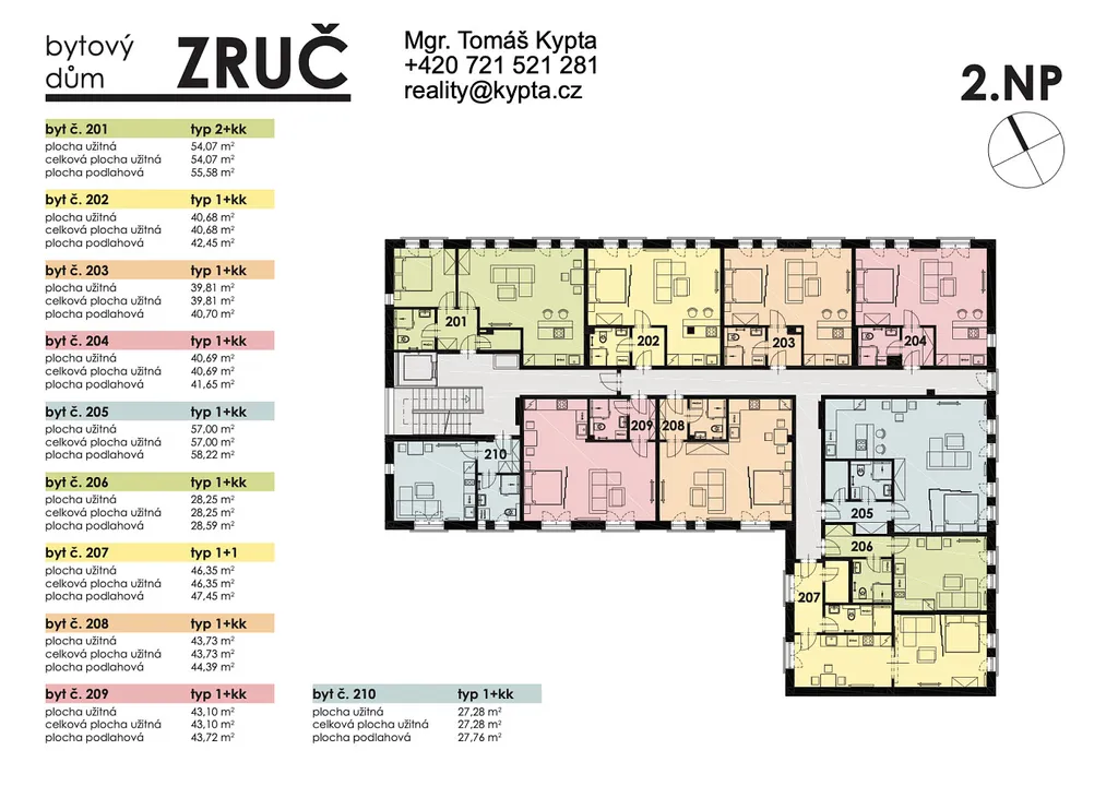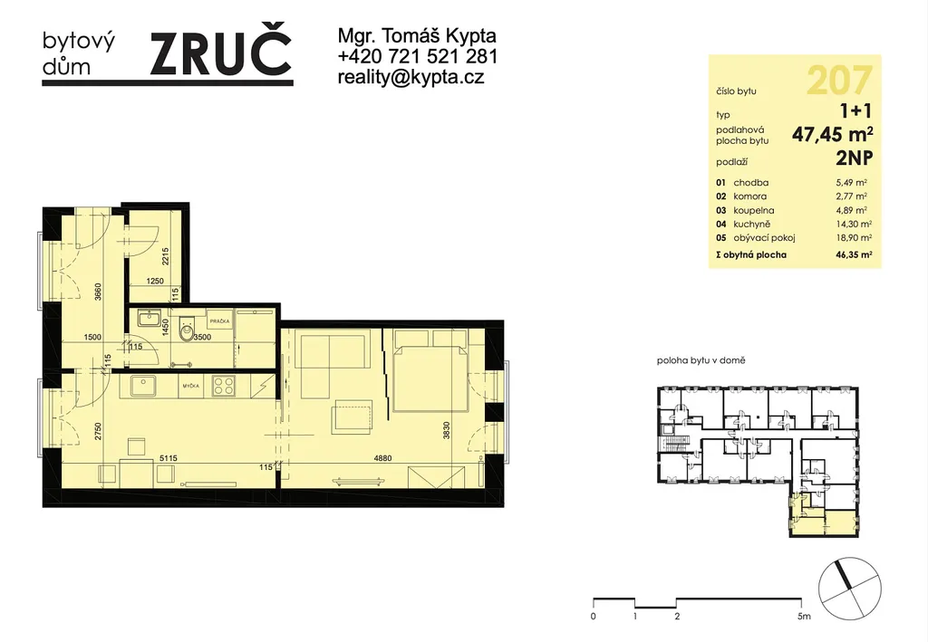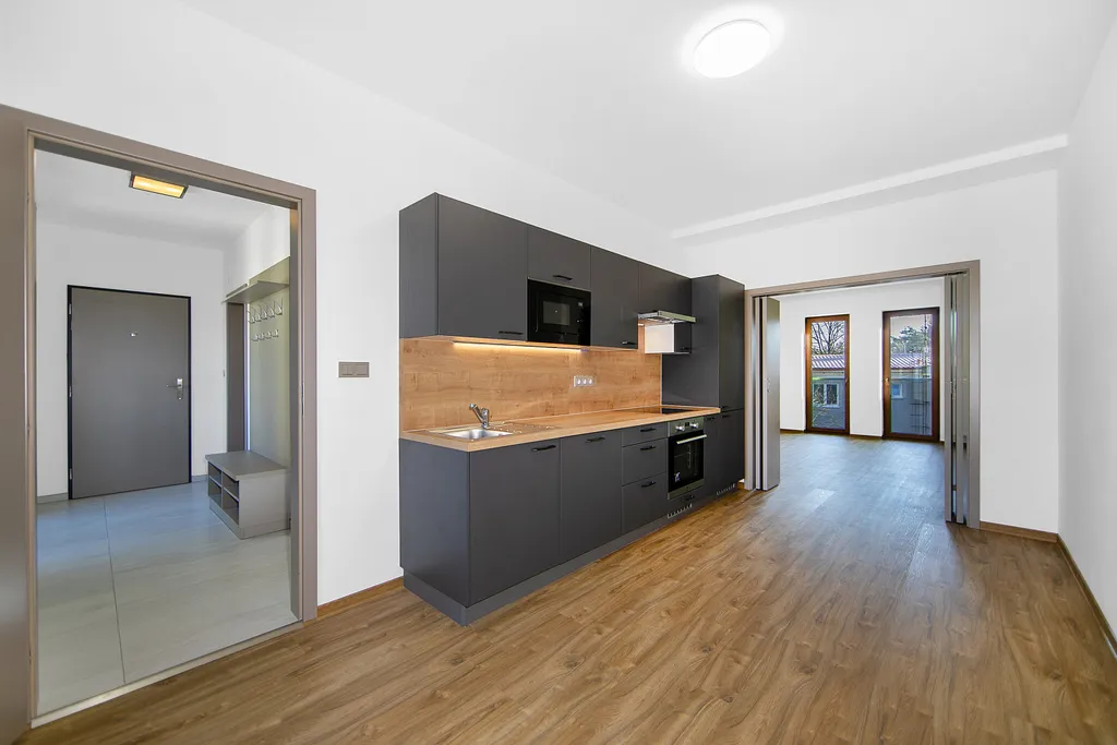 Nemovitost o dispozici 1 + 1 a výměře 47,45 m² se nachází se ve 2. NP budovy. Přístup do bytu je bezbariérový. V ceně pronájmu je již zahrnuto jedno venkovní parkovací stání, přičemž je možnost pronájmu i druhého soukromého parkovacího stání - za 1000,- Kč/měsíc.