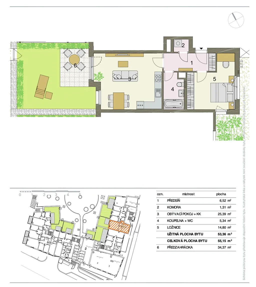 Dispozici tvoří prostorný obývací pokoj s kuchyňským koutem, ložnice, koupelna s vanou a WC, komora a předsíň. Velkým benefitem je předzahrádka o velikosti 35,8 m² s brankou na tichý, udržovaný vnitřní dvůr. Byt je orientovaný na východ a západ, díky čemuž je příjemně prosvětlený po celý den. Další velkou výhodou jsou nadstandardně vysoké, třímetrové stropy, které zvyšují pocit prostoru a vzdušnosti.