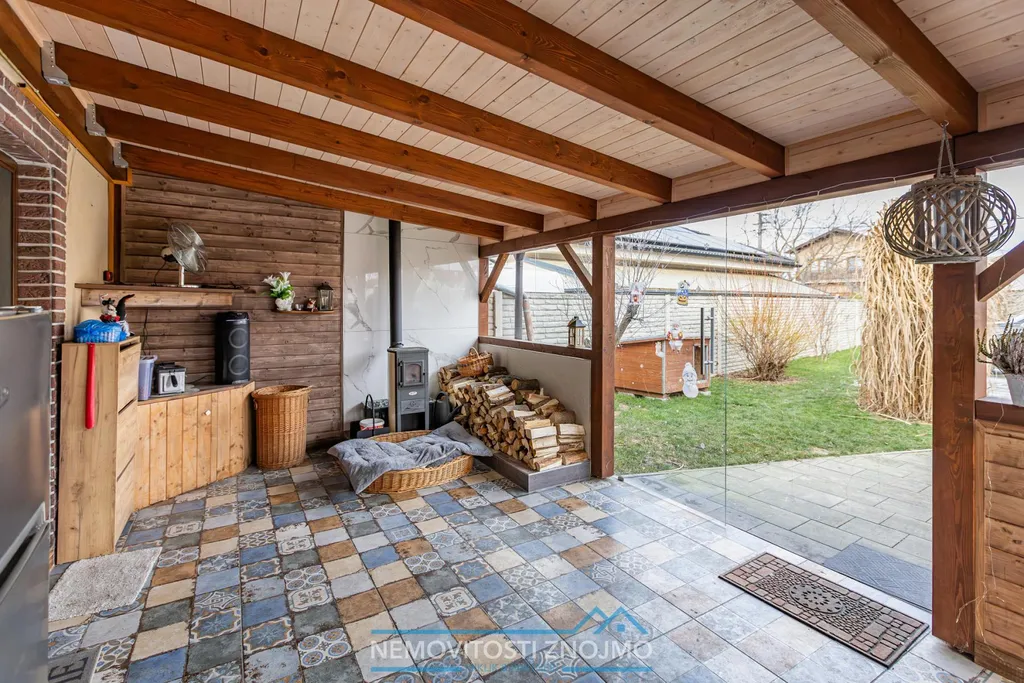 Za domem se dále nachází pergola, pod kterou se rozkládá mobilní vířívka. A dále se zde vchází do hospodářského zázemí, kde je kůlna a spíž.